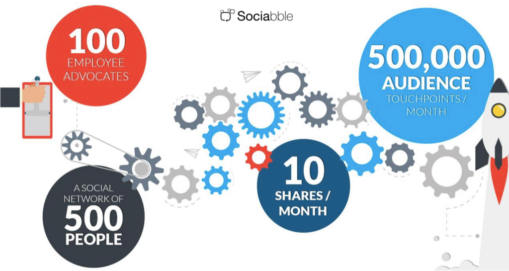 Employees give your brand reach it could never buy. Brand messages reach 561% further when shared by employees (Sociabble).